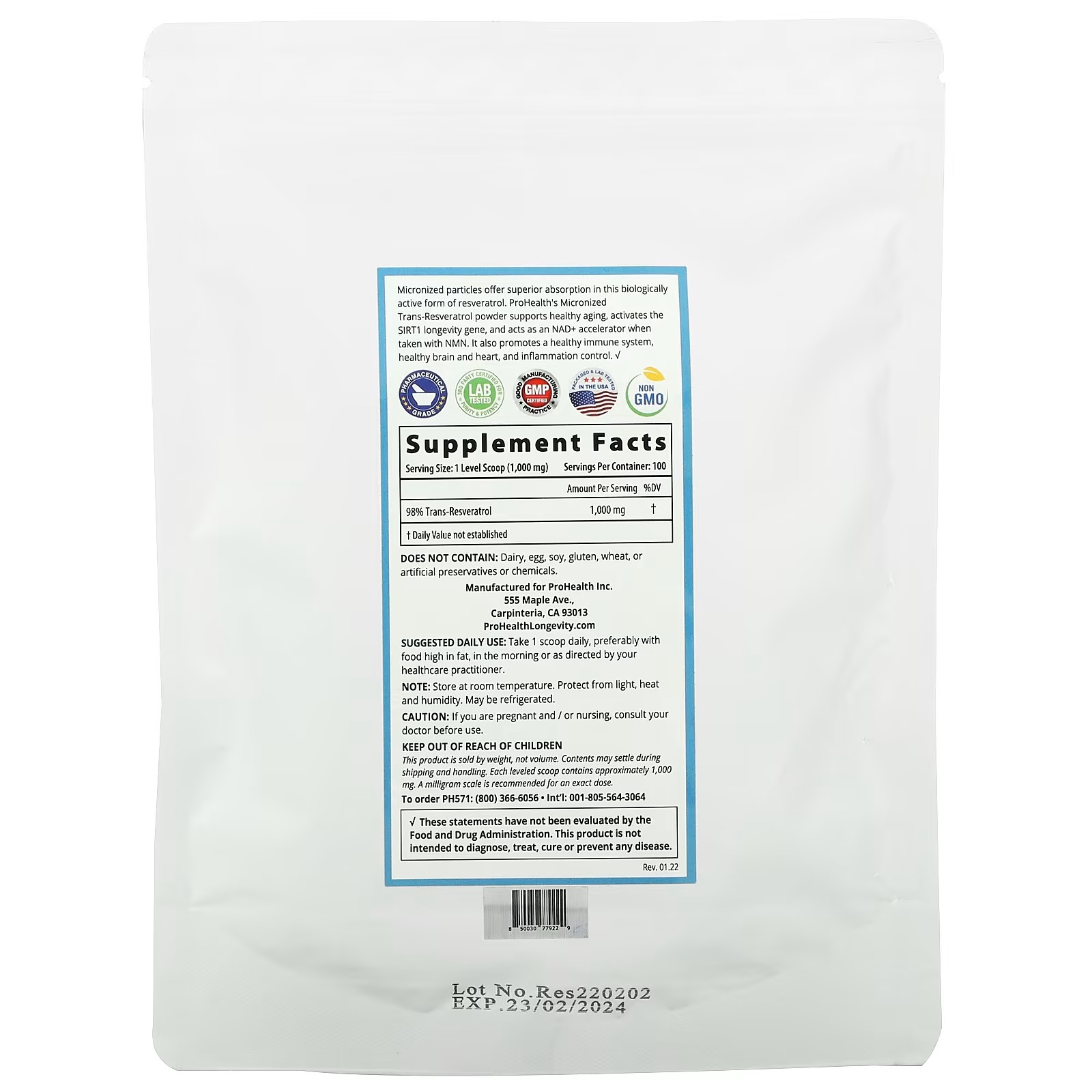 Micronized particles offer superior absorption in this biologically active form of resveratrol. ProHealth’s Micronized Trans-Resveratrol powder supports healthy aging, activates the SIRT1 longevity gene, and acts as an NAD+ accelerator when taken with NMN. It also promotes a healthy immune system, healthy brain and heart, and inflammation control.