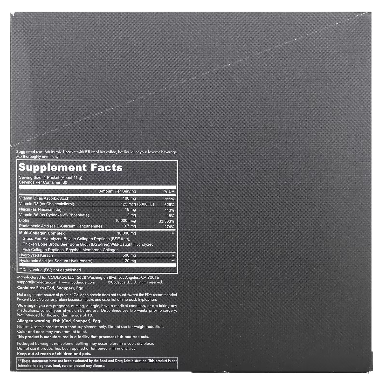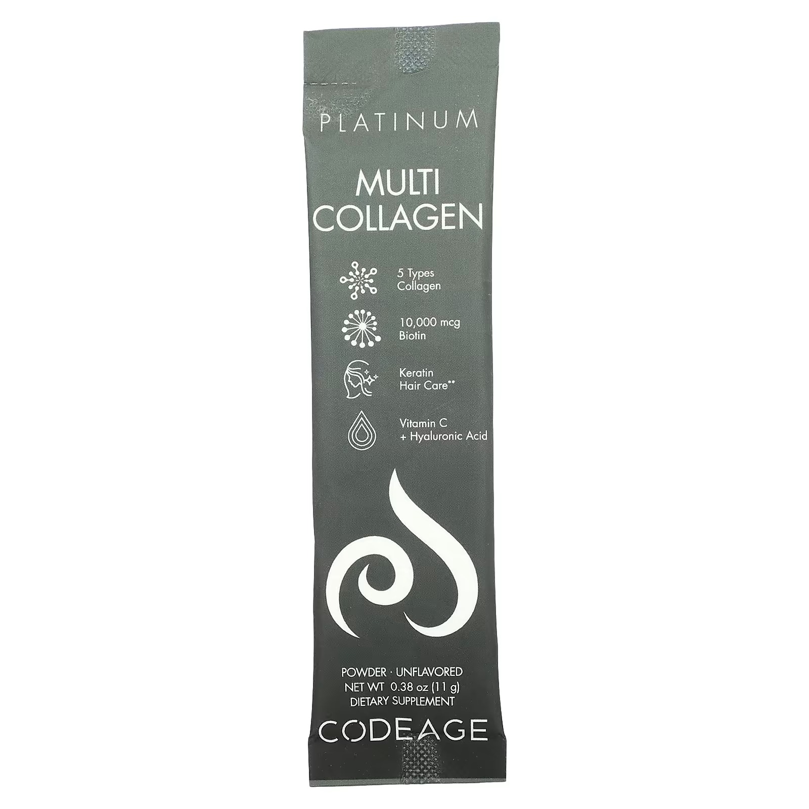 Available in convenient sticks, Codeage Multi Collagen Platinum premium powder formula combines 5 types of collagen peptides, 18 amino acids, biotin, keratin, and essential vitamins B6, C, and D3, plus hyaluronic acid and pantothenic acid. Convenient and all-in-one, each pack contains 30 sticks