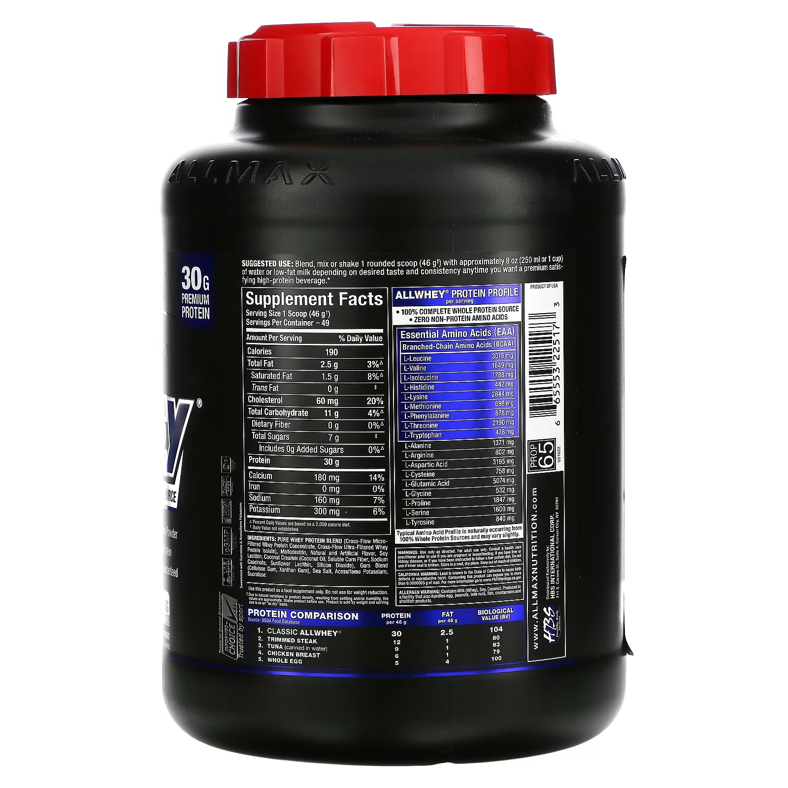 CLASSIC ALLWHEY® is a premium Whey Protein Concentrate blended with Whey Protein Isolate delivering 30 g Protein in a 46 g serving; tested and guaranteed! ALLWHEY delivers a clean, complete and whole protein made from the best source; 100% Whey Protein! Demand pure Whey Protein, great taste and amazing value. Demand superior taste and exceptional protein. DEMAND CLASSIC ALLWHEYⓇ!