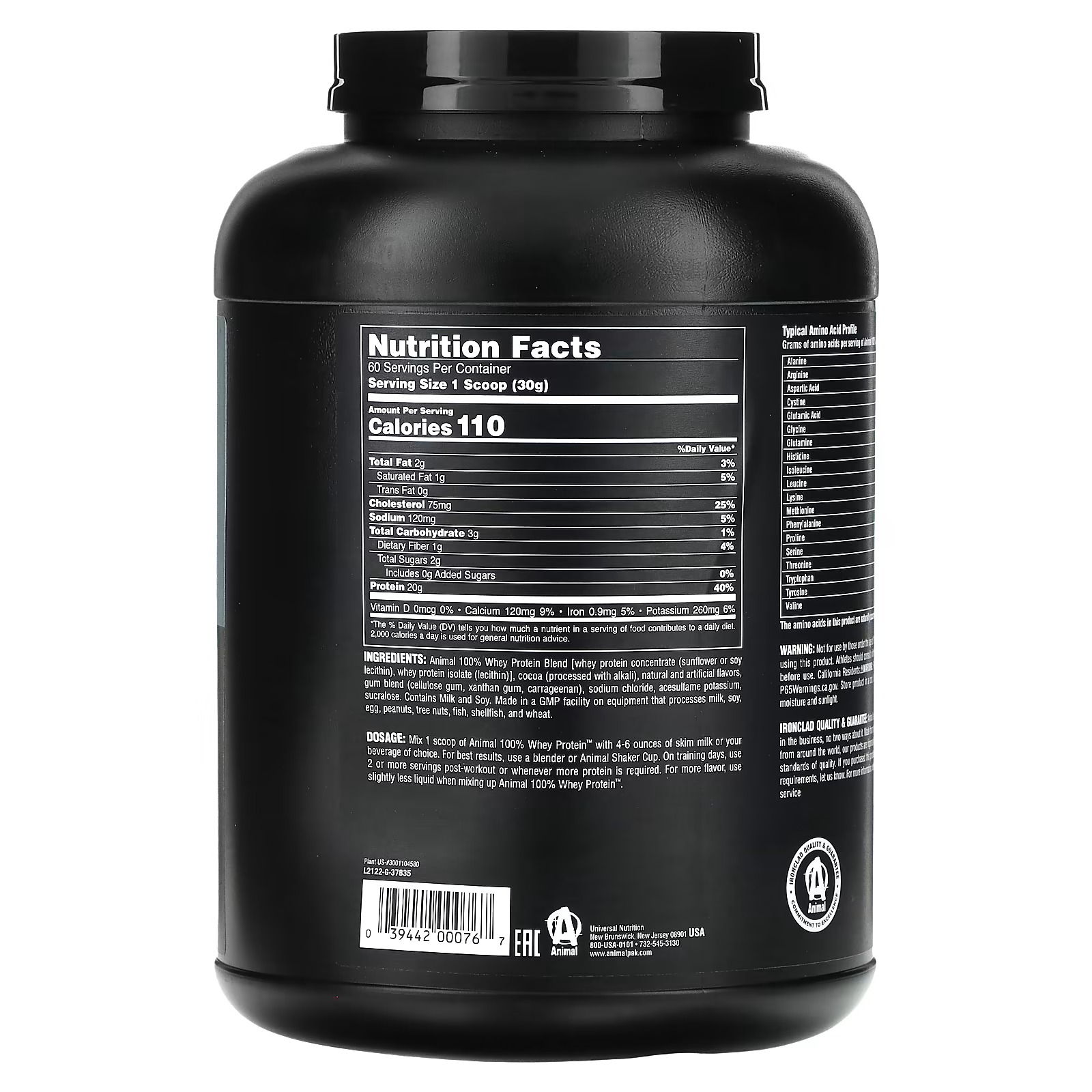 Animal 100% whey protein blend [whey protein concentrate (sunflower or soy lecithin), whey protein isolate (lecithin)], cocoa (processed with alkali), natural and artificial flavors, gum blend (cellulose gum, xanthan gum, carrageenan), sodium chloride, acesulfame potassium, sucralose.