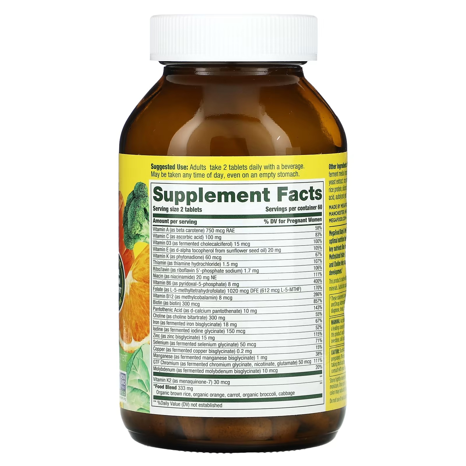 MegaFood Baby & Me 2 Prenatal Multi supports optimal nutrition before and during pregnancy with key nutrients like iron, vitamins B12, B6, and D3, Methylated folate (the active form of folic acid) and Choline help support brain and spinal cord development.